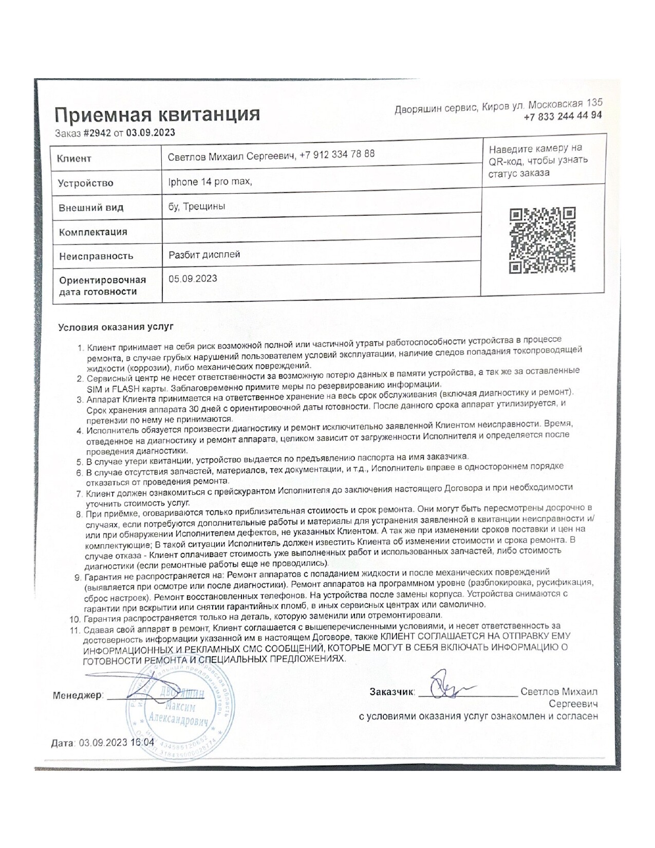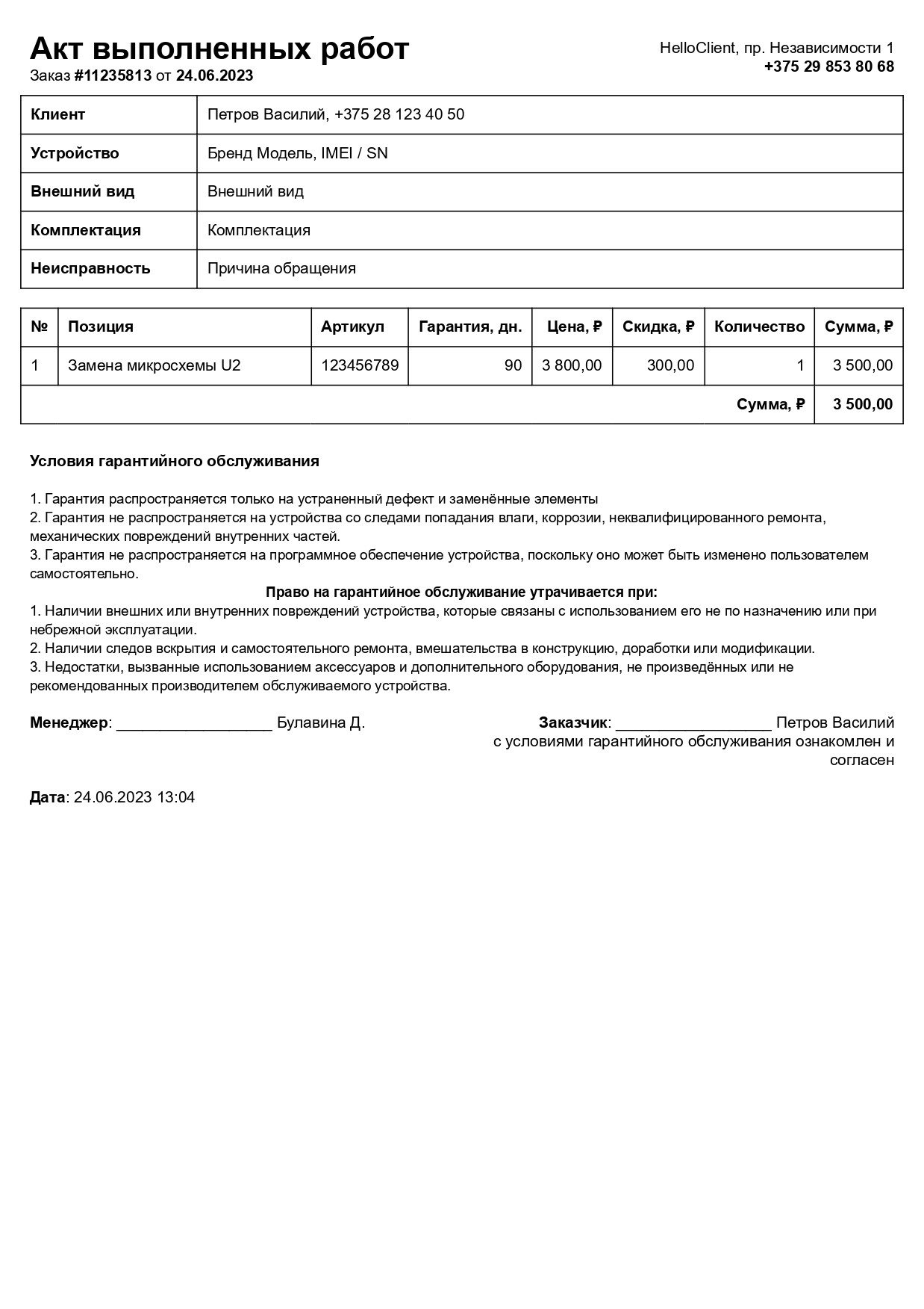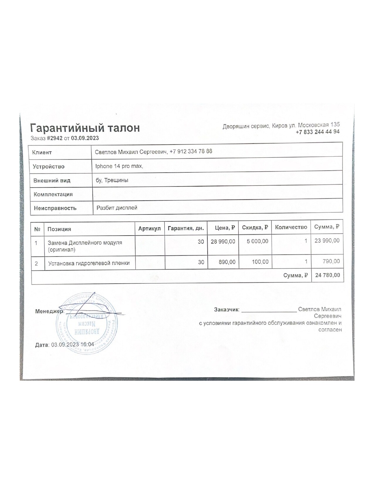 Гарантии на ремонт и используемые комплектующие прописаны в договоре. Если в течение гарантийного